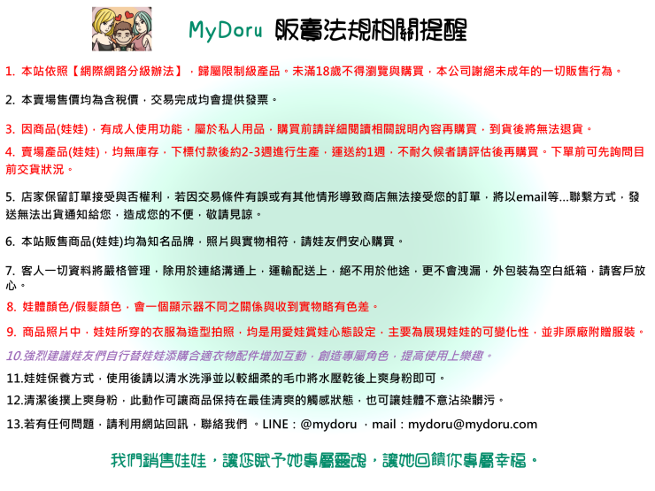 1.尺寸選項中,可點選同照片所有配置(身型/眼珠/假髮/膚色)。